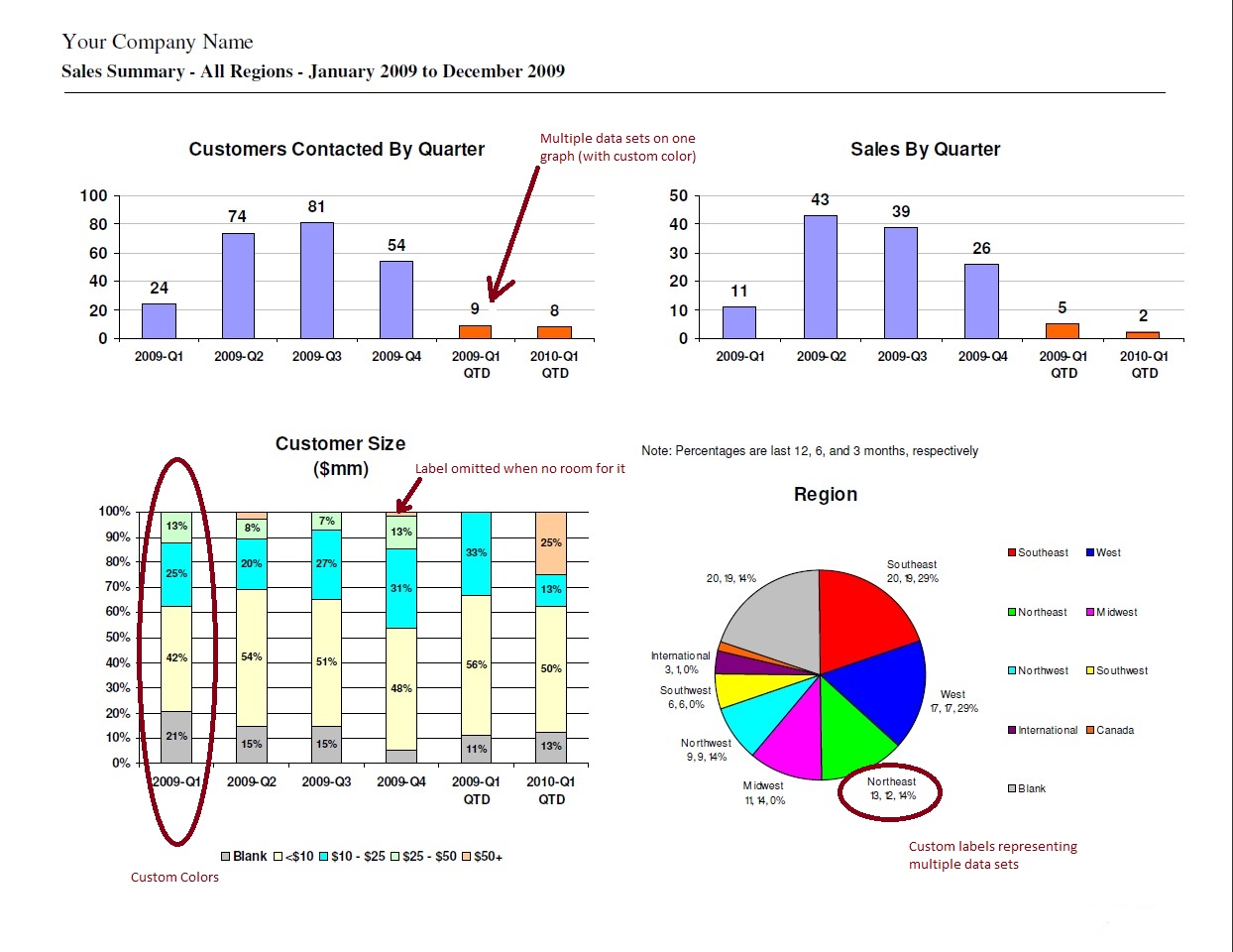 This image shows sample bar, stacked bar, and pie graphs. The graphs can be customized to include multiple data sets, custom labels, and custom colors.